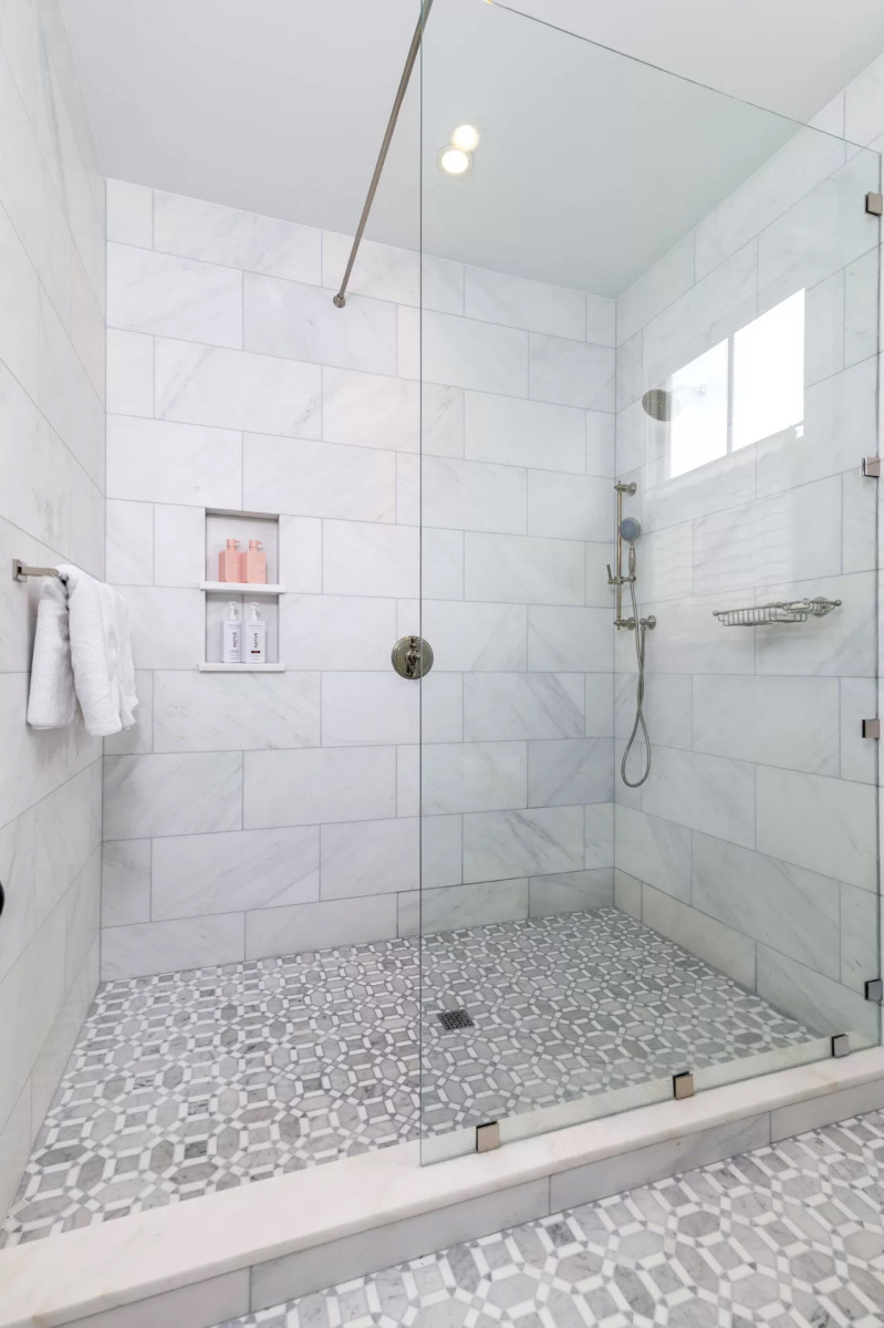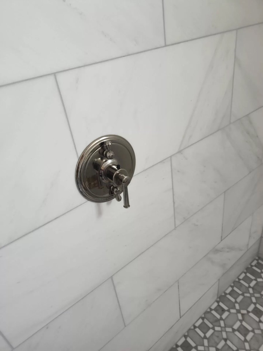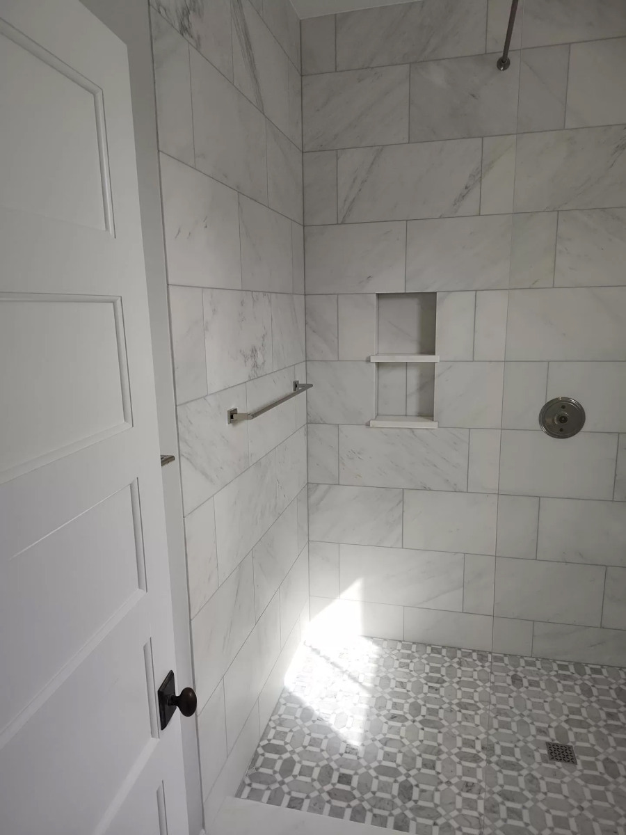 The centerpiece of this project is the new wet area, where we replaced the failing unit with a custom tiled shower. As seen in the photos, we utilized beautiful marble tile for the walls and a coordinating geometric mosaic for the shower floor. This choice respects the period style of the home, ensuring the new space feels like a natural extension of the original architecture rather than a mismatched addition. The marble provides a bright, clean backdrop that makes the room feel more expansive.