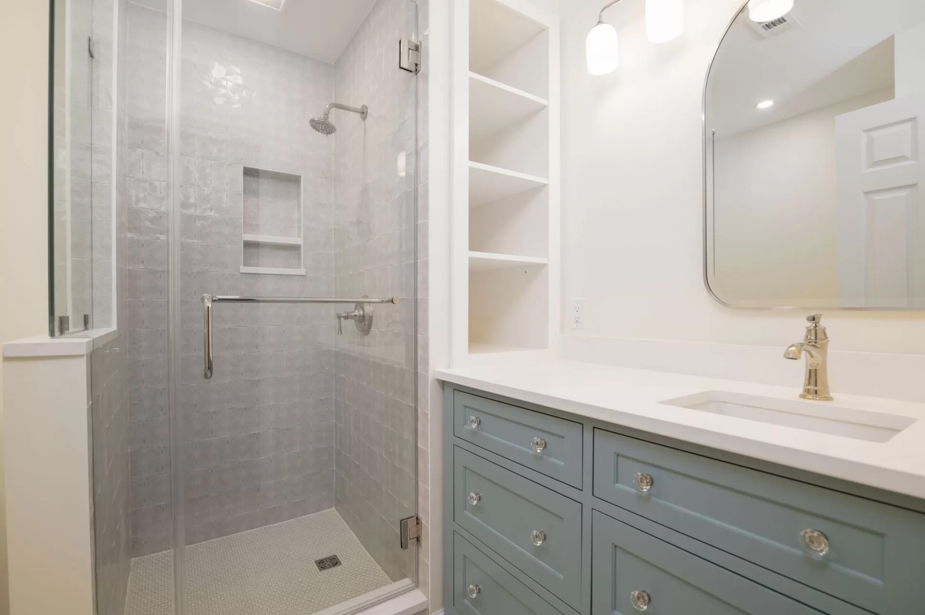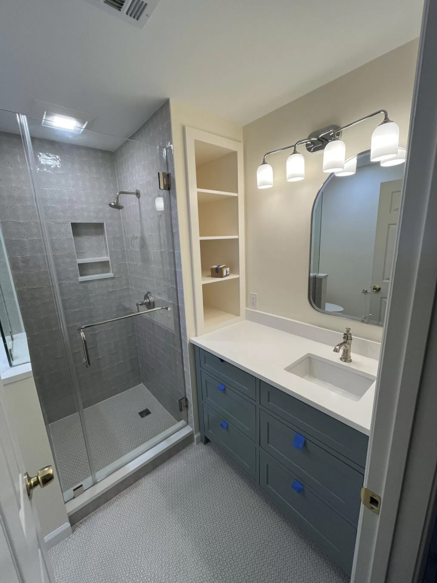 We installed a new tankless Rinnai water heater, which mounts efficiently to the wall and provides an endless supply of hot water. This mechanical upgrade allowed us to reclaim the volume of the old utility chase. We converted this dead space into a new hall closet, providing the homeowners with much-needed linen storage. Inside the bathroom, we installed custom cabinets with a grey finish and a white quartz top, further maximizing the storage potential of the vanity area.